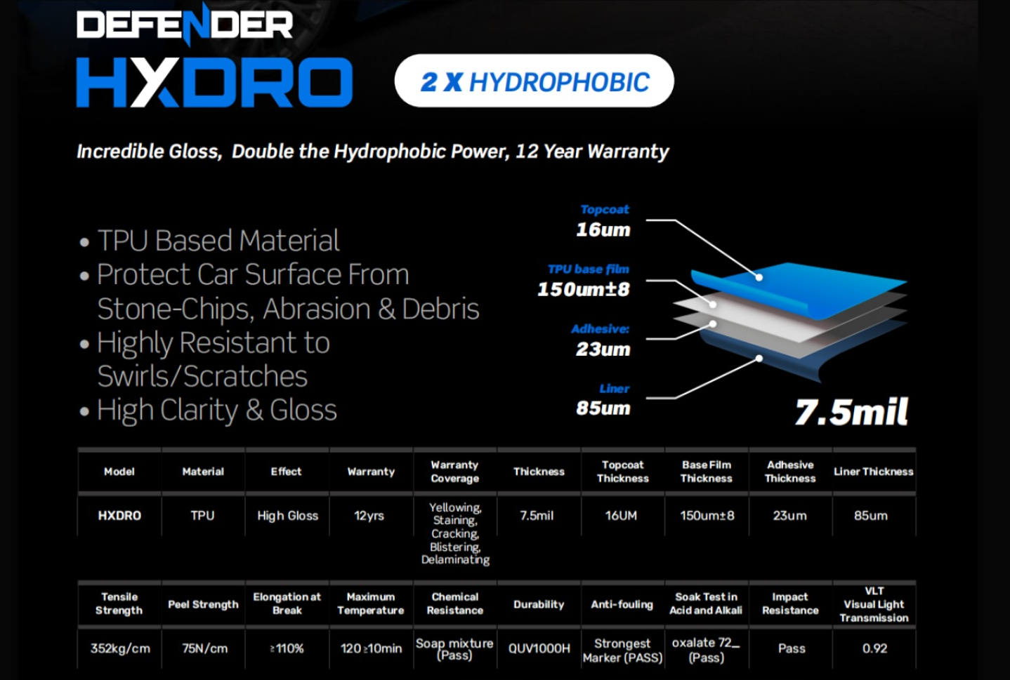 Почувствайте ненадминат блясък и водоотблъскващи свойства с GSWF DEFENDER Hydro. С двойна хидрофобна активност, технология за самовъзстановяване и висока издръжливост, това фолио предоставя върхова защита за боята на вашия автомобил.