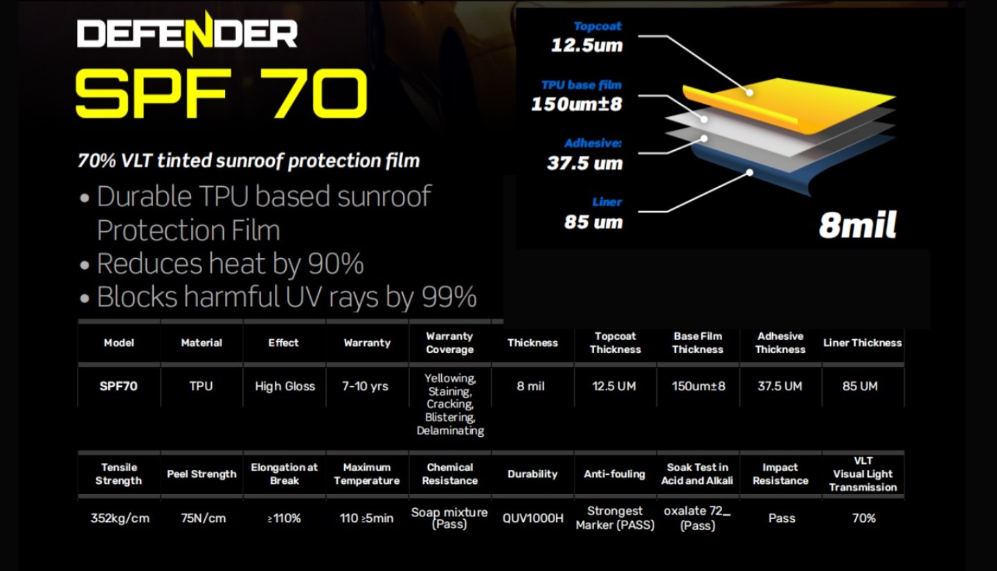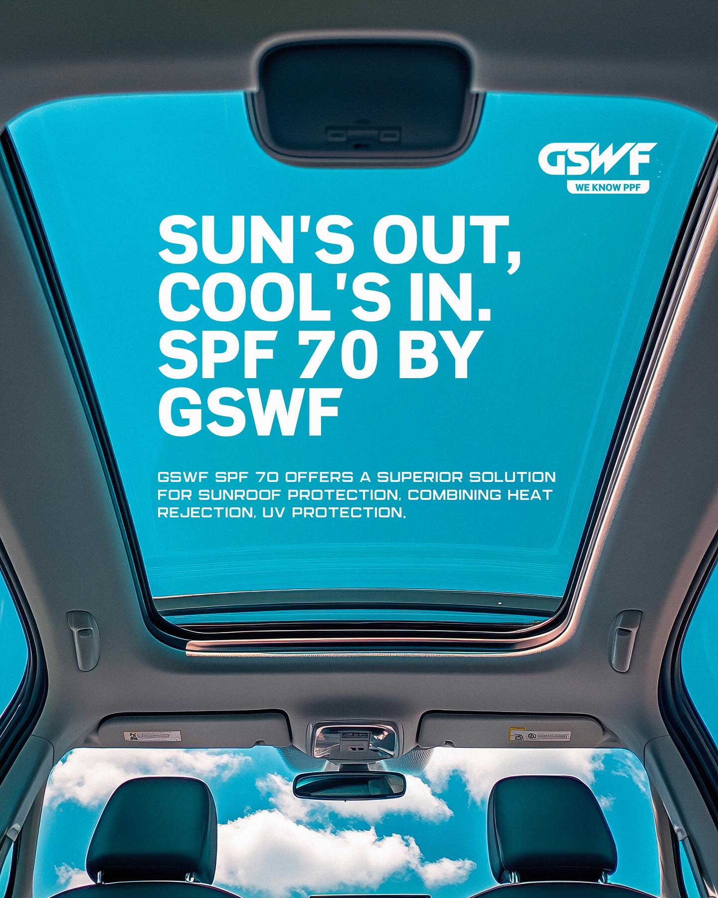 GSWF SPF 70 Sunroof Film е специално създадено защитно фолио за панорамни и стъклени покриви, което осигурява оптимална UV защита и намалява инфрачервената топлина до 70%. За разлика от стандартните тониращи фолиа, SPF 70 запазва видимостта и оригиналния външен вид на автомобила, като осигурява максимален комфорт и защита на интериора.